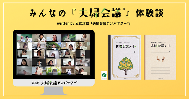 「夫婦会議アンバサダー」とは、「世帯経営ノート」や「夫婦会議ノート」などの『夫婦会議』専用ツールを使って、実際に『夫婦会議』を行う中で感じた効果や魅力、楽しさをご自身の体験と共に積極的に発信いただく『夫婦会議』の公式活動です。