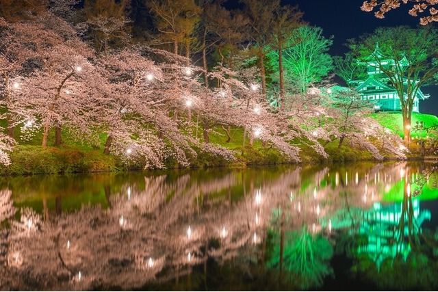 上野の恩賜公園、弘前城公園とともに、日本三大夜桜の一つに数えられる高田公園の桜。「高田城址公園観桜会」は、2025年で第100回を迎えます。公園周辺には約4,000本の桜があり、夜になるとぼんぼりに照らされ、美しい桜とライトアップされた高田城三重櫓が堀の水面に映るさまが幻想的で人々に感動をもたらせてくれます。
