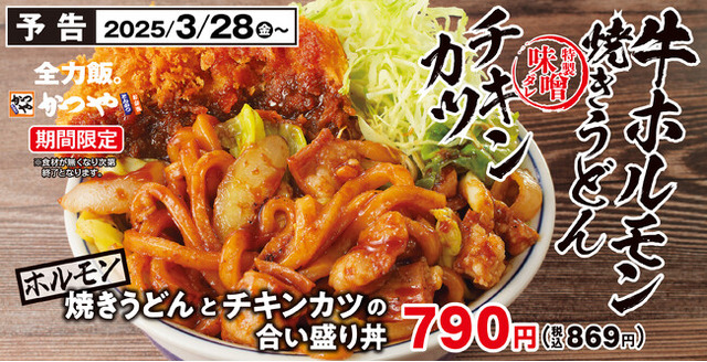 アークランドサービスホールディングス株式会社の子会社、とんかつ専門店「かつや」を展開している株式会社かつや(本社:東京都千代田区/代表:大内 勇一)は、国内「かつや」にて「ホルモン焼きうどんとチキンカツの合い盛り」を2025年3月28日(金)より期間限定で販売を開始いたします。