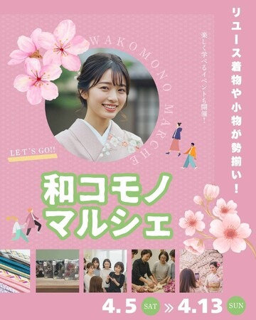 今回の「和コモノマルシェ」では、一点もののリユース着物を中心に、帯や浴衣、草履、バッグ、帯締め、半衿、和装小物など、着物初心者にも取り入れやすい和装アイテムを多数ご用意。