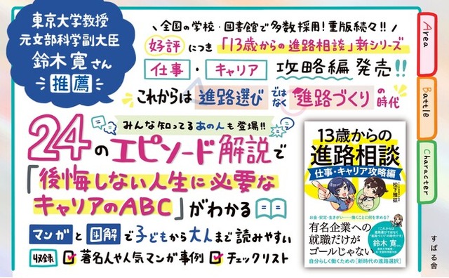 全国の学校や市区町村の図書館で続々と採用され、シリーズ累計1.4万部を突破している『13歳からの進路相談』に、新シリーズ<仕事・キャリア攻略編>が登場します。著者は、サイル学院高等部の学院長であり、株式会社13歳からの進路相談 代表取締役でもある松下 雅征。著名人のエピソードや人気マンガを引用しながら進路・キャリアの本質を解説。子どもから大人まで役立つ「後悔しない人生に必要なキャリアのABC」が、24のエピソードを通じてわかりやすく学べる一冊となっています。