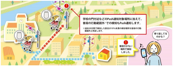 このたび、新たにお子さまやご高齢のご家族が想定外の場所にいることをいち早く把握できる「普段行かない場所での検知通知機能」を追加することで、さらなる「あんしん」を実現します。