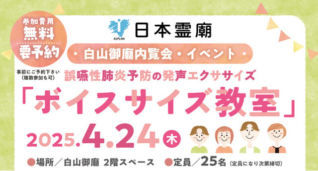 株式会社あいプラングループ(北海道札幌市)の日本霊廟がご紹介する白山御廟(東京都文京区白山1-34-6)で内覧会とボイスサイズ教室を4月24日(木)に開催いたします。ボイスサイズは誤嚥性肺炎の予防効果が期待できる発声エクササイズ。参加無料、事前予約制です。