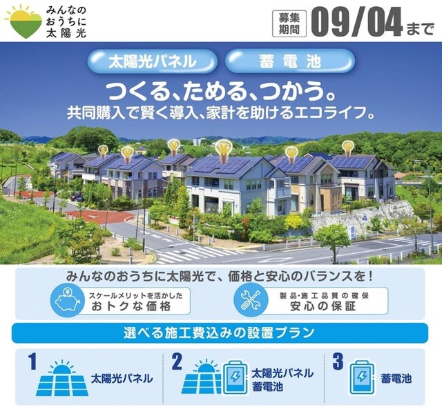 本事業は、多くの市民の皆様にご参加いただくことで、共同購入によるスケールメリットを活かし、太陽光パネルや蓄電池を、安心してよりおトクに購入できる仕組みです。地球にも家計にもやさしいエコな暮らしに向け、是非ご検討ください。
