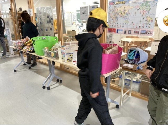 PTA役員が声掛けをする中で食品を持ってきてくれた児童たちの様子
