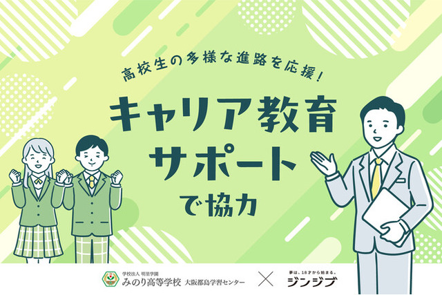 高校生の就職を支援している株式会社ジンジブ(大阪市、以下当社)は、2025年4月に新たに開校するみのり高等学校大阪都島学習センター(大阪市、本校:徳島県)へ、早期からのキャリア教育と進路選択のサポートについてのキャリア教育の導入を開始することが決まりました。