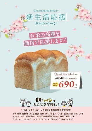 世界初の水分量100%食パンを全国7店舗で販売する食パン専門店「One Hundred Bakery(ワン八ドレッドベーカリー)」(併設カフェは全国に14店舗)が、コメ価格が高騰する今、期間限定で「新生活応援キャンペーン」を2025年4月1日(火)より開始致します。