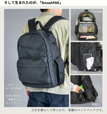 「SmashPAK(スマッシュパック)」は、子育て中のパパ・ママから圧倒的支持を受けているSmashBagシリーズから誕生した、ユニセックスデザインの多機能バックパックです。