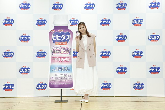 森永乳業は、「ビヒダス ヨーグルト 便通改善 1日分の鉄分 ドリンクタイプ」を4月8日(火)より全国で新発売します。これを記念して、3月27日(木)に大手町サンケイビルにて『「ビヒダス ヨーグルト 便通改善 1日分の鉄分 ドリンクタイプ」新商品発表会』を開催し、アーティスト・タレントの伊藤千晃さんと管理栄養士の浅野まみこさんがゲストで登壇しました。