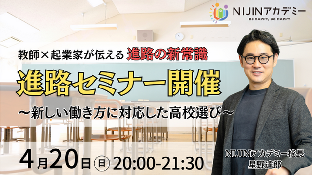 株式会社NIJIN(本社:東京都江東区、代表取締役:星野達郎)が運営する不登校オルタナティブスクール『NIJINアカデミー』の校長星野達郎は、2025年4月20日に新しい働き方に対応した高校選びについての特別進路セミナーを開催いたします。