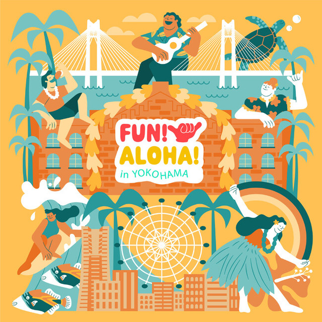 メインビジュアルは、ホノルルを拠点に活動するイラストレーターのKelsie Dayna氏が制作。横浜赤レンガ倉庫や横浜の名所と、ハワイのアクティビティ等を盛り込み、“FUN! ALOHA!”を表現したビジュアルが完成しました。