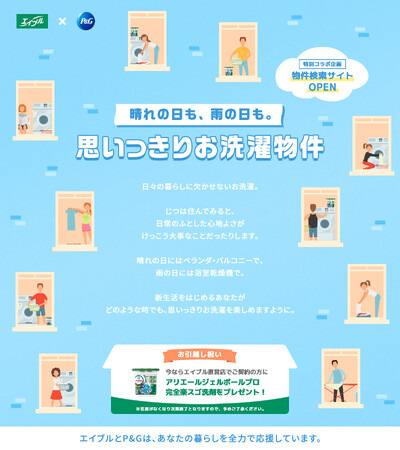 株式会社エイブル(本社:東京都港区、以下エイブル)は、P&Gジャパン合同会社(本社:神戸市、以下P&G)とともに、新生活をはじめる方に、晴れの日も雨の日も快適にお洗濯ができる物件情報サイト「思いっきりお洗濯物件サイト」を2025年4月1日(火) リリースいたします。