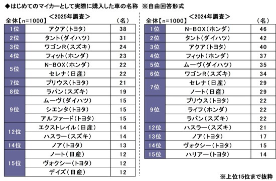 昨年の調査結果(※)と比較すると、「アクア(トヨタ)」は2024年3位から順位を上げ、2025年は1位となりました。