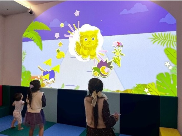 キッズスペースでは「Sky Trip ~おきなわそらのたび~」をコンセプトに、壁面に沖縄の「キレイな海」「マングローブの森」「伝統的な琉球の村」をイメージした風景イラストと、シルエットで描かれた「首里城」「沖縄そば」「シーサー」など全 26 種類の沖縄らしいアイテムを投影いたします。