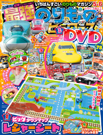 キッズ向けのりもの雑誌『最強のりものヒーローズ5-6月号』は、タウンマップのレジャーシートが付録! 90cm×60cmのビッグサイズなタウンマップで、ミニカーを走らせて遊ぼう! 厚みのあるフカフカなレジャーシートでおでかけにもピッタリ♪ DVDではドクターイエローのおそうじイベントや、消防車が大集合の消防出初式を紹介! レジャーシートにのせて遊べる紙工作、のりものシール、新幹線の遊べる折り紙など盛りだくさんの1冊です☆