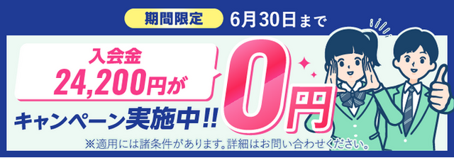 4月1日~6月30日までにご入会いただいた方限定で、入会金24,200円のところを「0円」でご案内させていただきます。(※適用には諸条件があります。詳しくはお問い合わせください)