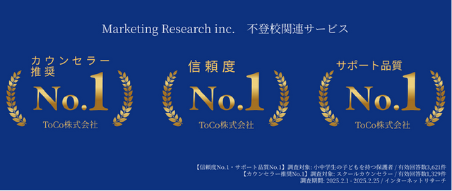 2025年3月20日、ToCo株式会社(本社:東京都渋谷区、CEO:青山登)が提供する再登校支援サービス「ToCo(トーコ)」は、2025年2月1日から2025年2月25日にかけて実施された市場調査(Marketing Research)において、「カウンセラー推奨・信頼度・サポート品質」部門でNo.1のトップ評価を獲得しました。