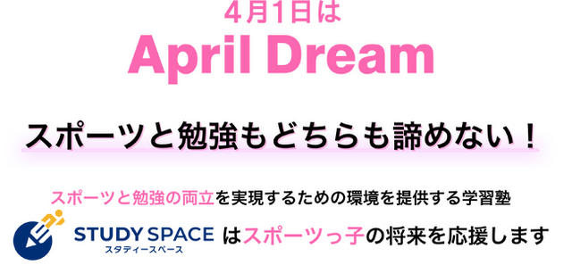 スポーツも勉強の両立を“目指し”、そして“実現する”学習塾、STUDY SPACEは、4月1日を夢を発信する日にしようとするApril Dreamに賛同しています。このプレスリリースは「株式会社Space21」の夢です。