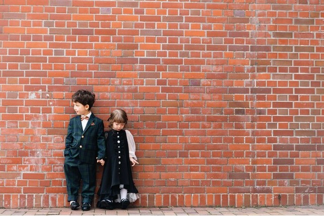 蝶ネクタイの色味がレンガとマッチし、統一感がありつつも主役が引き立つコーディネートに。