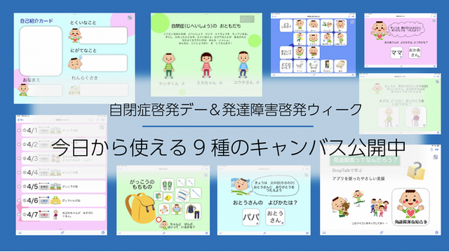 今回の取り組みにあわせて、自閉症や発達障害のあるお子さんと一緒に「わかりやすく」「楽しく」学べるキャンバス、また日常生活や支援に役立つ実用的なキャンバスを9種類新たに制作しました。これらはDropTalkの無料版でも使えるようになっており、公式ブログよりダウンロード可能です。