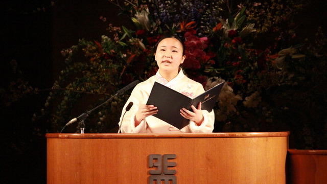 在校生を代表してあいさつする松浦真菜さん。英語国際学部英語国際学科3年