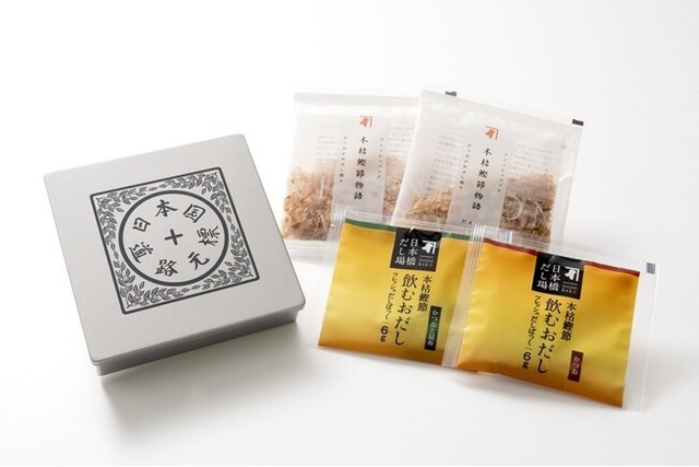 五街道の起点を示す標識である日本国道路元標をデザインした缶にかつお節、飲むおだしを詰め合わせました。