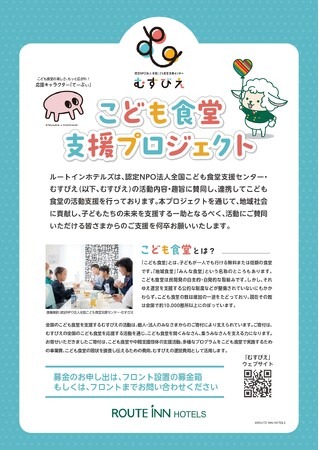 ルートインジャパン株式会社(本店:東京都品川区大井一丁目35 番3 号、代表取締役 永山泰樹)を主体とするルートインホテルズは、2025年4月3日より認定NPO法人全国こども食堂支援センター・むすびえ(所在地:東京都渋谷区、理事長:湯浅誠、以下「むすびえ」)の活動内容・趣旨に賛同し、連携してこども食堂の活動支援を行うこととなりました。本プロジェクトを通じて、地域社会に貢献し、子どもたちの未来を支援する一助となるべく、活動にご賛同いただけるご宿泊者向けに、全国のホテルで募金活動を実施いたします。