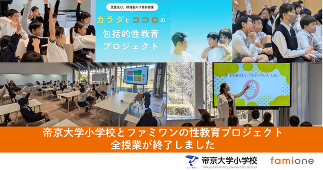 「子どもを願うすべての人によりそい 幸せな人生を歩める社会をつくる」をビジョンに掲げ、法人の従業員向け福利厚生や自治体の住民向け支援を行うヘルスケアサポートサービス「ファミワン」 https://famione.com/benefit/などを展開する株式会社ファミワン(本社:東京都渋谷区、代表取締役:石川勇介)は、帝京大学小学校(東京都多摩市、校長 石井 卓之)と共同で行われた「カラダとココロの包括的性教育プロジェクト」による授業が全て終了しました。