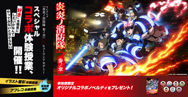 教育事業を展開するヒューマンアカデミー株式会社(本社:東京都新宿区、代表取締役:今堀健治、以下「当社」)の全日制専門校「総合学園ヒューマンアカデミー」(以下「当学園」)では、2025年4月4日(金)より放送開始のTVアニメ『炎炎ノ消防隊 参ノ章』とのスペシャルコラボレーションを実施し、声優やマンガ家、イラストレーターを目指す学生が所属する「パフォーミングアーツカレッジ」や「マンガ・イラストカレッジ」の授業教材として、放送中の『炎炎ノ消防隊 参ノ章』の最新アニメの映像と線画素材を授業教材として使用することが決定いたしました。