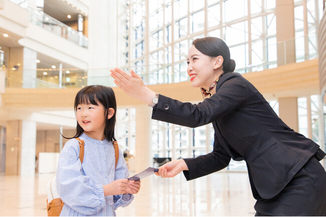 挨拶練習、お客さまのお出迎え、エレベーター案内など