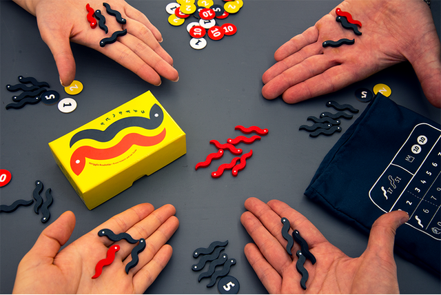 『ウナギかヘビか』は、ヘビも交じる袋の中からウナギのつかみ取りを行う、運と心理戦がからみ合うテーブルゲーム。誰よりも多くウナギを手に入れたいのですが、全員がつかんでしまったヘビが規定以上になると「ヘビあふれ」になり、その時にコマを一番多くつかんでいたプレイヤーはすべてのウナギを失ってしまいます。誰よりもウナギを手に入れて高得点を狙いたい、でもヘビがあふれてしまうのは恐ろしい…。たくさんつかむか、少しだけつかむか、それとも勝負から降りるか。相手の表情をしっかり見ながら己の欲望をコントロールして決断することを迫られる!運と心理戦がからみ合う、新感覚のつかみ取りゲームです。