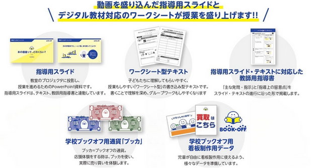 教材データ、指導案、ワークシート、学校ブックオフの時に使用する仮想通貨「ブッカ」、店舗のぼり制作用のロゴデータなど教材データ、ツール一式を提供しています。プログラム3.店舗体験の際、本が足りない場合は、ブックオフより寄贈することも可能です。