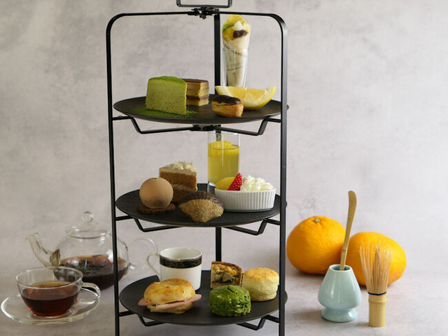 日本国内有数のお茶どころである静岡県。その静岡県が誇る「抹茶」、ほうじ茶」、和紅茶「べにふうき」「緑茶」と季節の柑橘である甘夏「スルガエレガンス」や「伊豆ニューサマーオレンジ」をアクセントにした合計10種のスイーツと4種のセイヴォリーをご用意いたしました。
