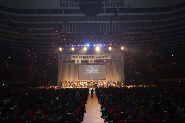 摂南大学(学長:久保康之、以下 久保学長)は、4月2日(水)に大阪城ホールにて「2025年度入学宣誓式」を執り行い、2,813人(学部・大学院合計)の新入生を迎えました。式典後には、有志の在学生と職員が約半年間かけて企画・運営してきた「新入生歓迎行事」を開催しました。期待や不安を抱えて入学する新入生に、これからの大学生活に明るいイメージを描いてもらえるよう、「ワクワク」と「感動」を伝えるメッセージやパフォーマンスを披露しました。この本学独自の取り組みは、2017年度からはじまり今回で9年目となります。