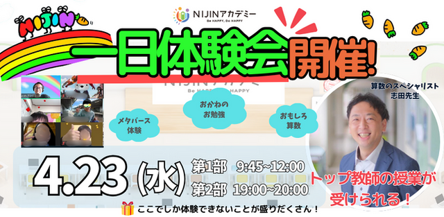 株式会社NIJIN(本社:東京都江東区、代表取締役:星野達郎)が運営する不登校オルタナティブスクール『NIJINアカデミー』は、4/23(水)にメタバースで体験できる授業体験会を実施することをお知らせいたします。