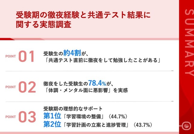 - 01|受験生の約4割が、「共通テスト直前に徹夜をして勉強したことがある」