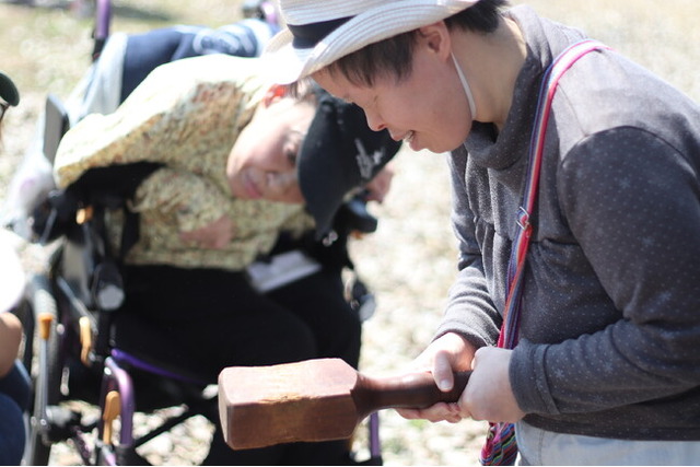 前回のキャンプイベントでも好評だった、テント・タープの設営体験、薪割り体験を実施いたしました。薪割り体験では薪割り台を使用し、障害を持つ方々にも安全に体験していただきました。