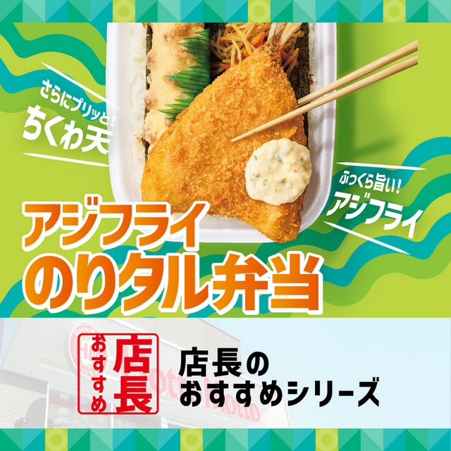 『アジフライのりタル弁当』は、ふっくらとしたボリュームのある“アジフライ”と大きな“ちくわ天”がのった満足感のあるメニューで、ワンコインで楽しめるのが魅力です。ぜひ一度ご賞味ください。