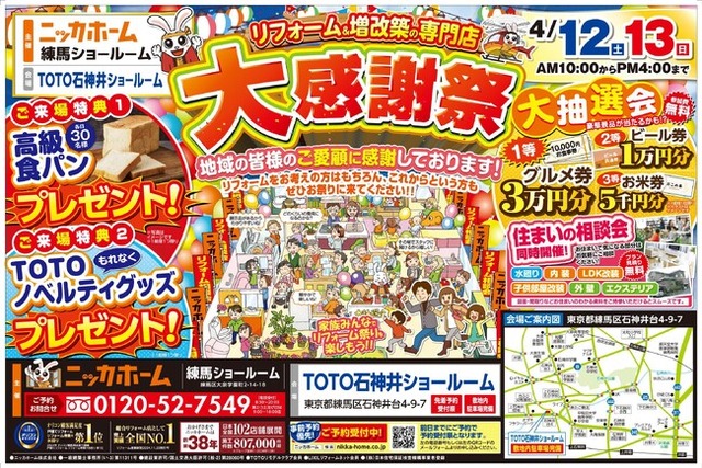ニッカホーム株式会社(本社:愛知県名古屋市緑区篭山、代表取締役社長:西田裕久、以下 ニッカホーム)の関東支社・ニッカホーム練馬ショールームが「大感謝祭」と題したイベントを開催決定!