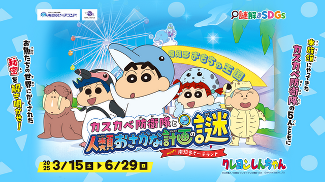 南知多ビーチランド&南知多おもちゃ王国(知多郡美浜町奥田428-1 所長:齊藤 敬一郎)では、2025年3月15日(土)~6月29日(日)の期間、人気アニメ作品『クレヨンしんちゃん』とコラボレーションした水族館謎解きイベント「カスカベ防衛隊と人類おさかな計画の謎meets南知多ビーチランド」を開催します。