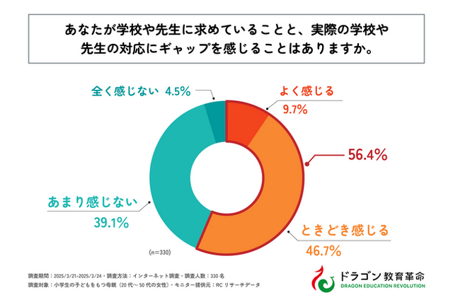 小学生の子を持つ母親の半数以上が、自分が学校や先生に求めていることと、実際の学校や先生の対応にギャップを感じることがある