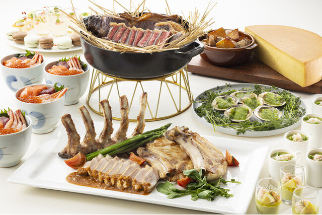 ・メニュー例:北海道産黒毛和牛のローストビーフ レフォールソース、ブラックアンガス牛サーロインステーキの藁焼き、苺のモンブラン 他