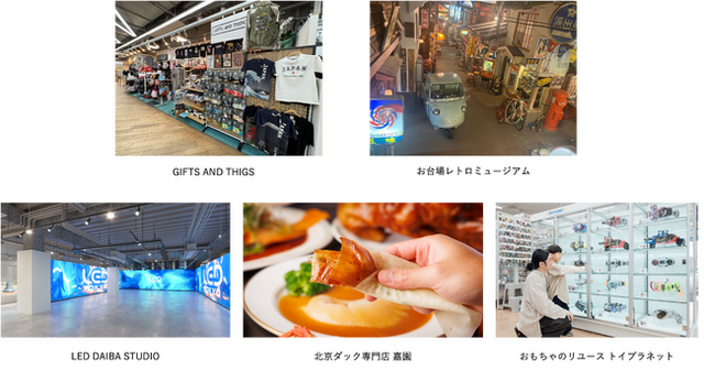 2025年2月7日(金)にオープンした、日本のお土産を多数取り扱う「GIFTS AND THINGS」を皮切りに、4月25日(金)には、昭和時代の街並みや暮らしを再現する体験型施設「お台場レトロミュージアム」が、以降も本場・中国北京の味をリーズナブルに楽しむことができる「北京ダック専門店 嘉園」、巨大LEDビジョンで没入体験ができる「LED DAIBA STUDIO」、さらに6月20日(金)には、子どもから大人まで楽しめるリサイクルショップ「おもちゃのリユース トイプラネット」が都内に初めてオープンします。