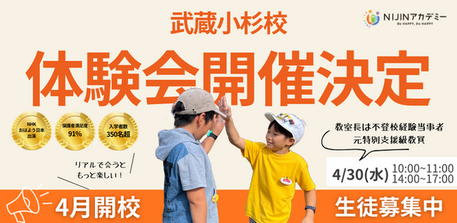 株式会社NIJIN(本社:東京都江東区、代表取締役:星野達郎)が運営する不登校オルタナティブスクール『NIJINアカデミー』は、メタバースとリアルを掛け合わせたハイブリット通学「武蔵小杉校」を開校するとともに、4/30(水)に実際に教室をみたり、教室長と話せるリアル教室体験会を実施することをお知らせいたします。