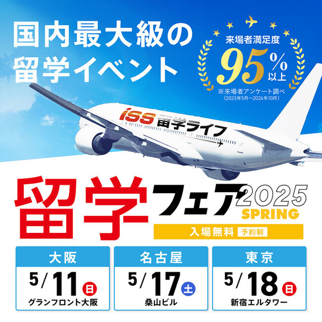 株式会社増進会ホールディングス(Z会グループ)のグループ会社で、留学エージェントの「ISS留学ライフ」(運営会社:株式会社国際交流センター、本社:東京都新宿区、代表取締役社長:石谷雄也)は、2025年5月11日(日)大阪、5月17日(土)名古屋、5月18日(日)東京で、留学フェアを開催します。