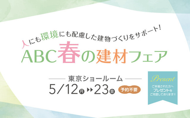 建材の開発、製造、輸入、販売を行う(株)エービーシー商会(本社:東京都千代田区、社長:東川 茂樹)は、2025年5月12日(月)~5月 23日(金)の期間、東京ショールームにて、「人にも環境にも配慮した建物づくりをサポート!ABC春の建材フェア」を開催いたします。