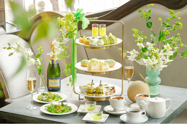 旬の国産メロンをふんだんに使用した、メロンづくしの贅沢なアフタヌーンティーは、初夏らしい爽やかなグリーンとホワイトのフラワーをまとったエレガントな装いで登場いたします。