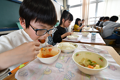 この日は、全市立小中学校で令和7年度の給食がスタート。市立桃園小学校では給食の時間になると子どもたちは手際よく配膳を完了させ、「いただきます」と元気よく挨拶し、笑顔で給食を楽しんでいました。