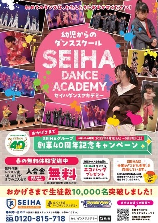 全国で子ども向けスクールを展開する株式会社セイハダンスアカデミー(福岡県福岡市,代表取締役:坂口 正美,以下セイハダンスアカデミー)は、2025年4月1日(火)より「春のキャンペーン」を実施中です。創業40周年を記念した特別企画として、入会金無料&SEIHAオリジナルエコバッグをプレゼント。お得に始められるこの春、ぜひお近くの教室で体験レッスンを!
