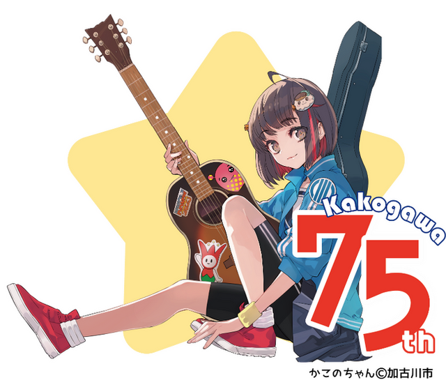 そこで、令和5年8月から加古川観光大使を務めるイラストレーターいとうのいぢさんが描き下ろした加古川市まちの魅力発信キャラクター「かこのちゃん」とコラボレーションした、加古川市制75周年記念ロゴマークを製作しました。令和7年4月から令和8年3月までの期間、市の承認を受ければ無償で使用することが可能です。